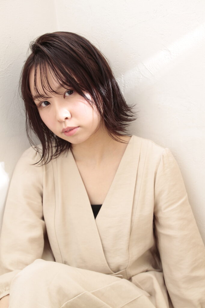 【コメント】 | 肩上レングスのボブ。動きが出やすいように毛先を軽く。毛先を外ハネにブローして、バーム系スタイリング剤でウェットな質感に。ボリュームを抑えるように軽く耳掛けして。 |