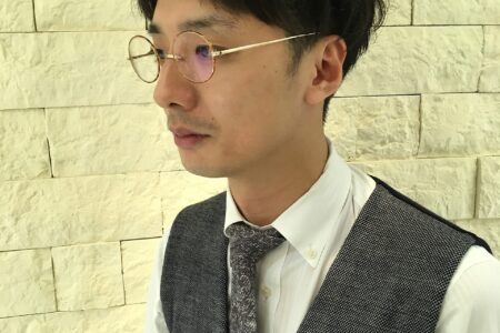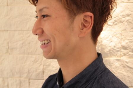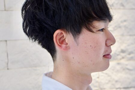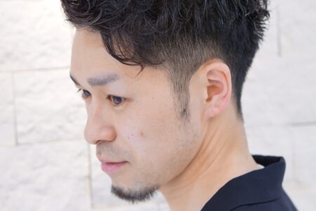 全体的にワンカールくらいのパーマ。横から襟足にかけて幅広く刈り上げ。柔らかめのワックスをなじませています。