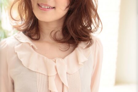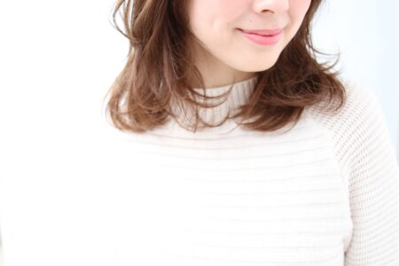 鎖骨レングスのミディアムレイヤー。毛先のみにワンカールで柔らかい印象のストレートスタイルに!優しく髪を振りながら乾かして、仕上げにソフトワックスで軽く束感を!